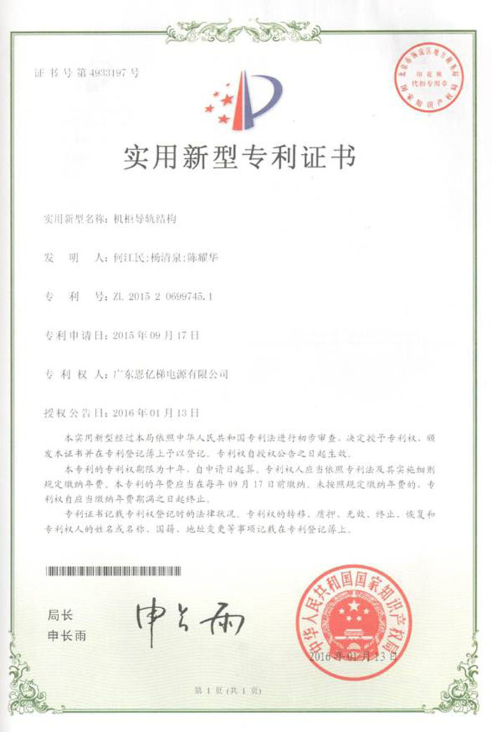 專利證書(機(jī)柜導(dǎo)軌結(jié)構(gòu))