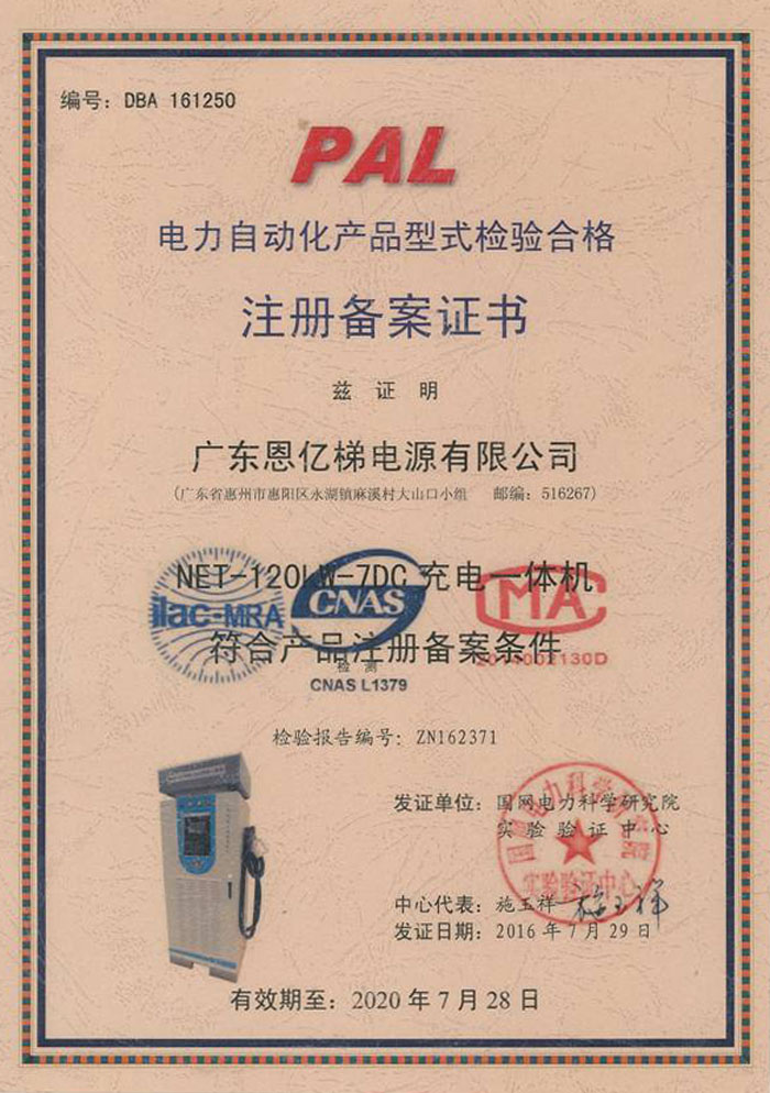 電力自動化產品型式檢驗合格注冊備案證書(充電一體機)